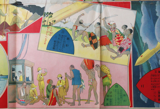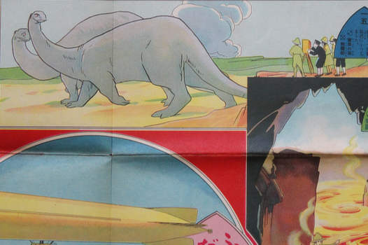 The new year gift from the magazine Ryoyu. Not to be confused with the comparatively common sugoroku drawn by Okamoto Kiichi and published in 1918 which is just submarines and diving suits. This is proper perilous undersea and aerial expedition through lost worlds. Like all sensible Japanese children they traveled well armed and a few judicious shots quickly sort out some truculent tribesmen. The dinosaurs might owe a lot to Winsor McCay but all dinosaurs after 1914 have some Gertie in them.