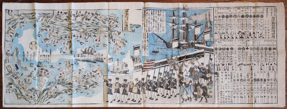 Kawaraban. Perry and the black ships. 海陸御固御場所附 [Kairiku Okatame Onbasho Tsuke]. n.p. (1854). 35x93cm colour woodcut on two joined sheets. A couple of small holes; a nice copy. Au$3600