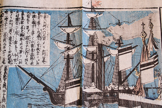 These illicit illustrated news sheets - kawaraban - for the streets were produced by the million for a couple of hundred years so of course few survive. They were produced for anything more interesting than the drop of a hat and the arrival of the Black Ships, the American squadron commanded by Perry, in 1853 and 54 eclipsed any and all tiresome earthquakes, fires, plagues, famines, murders and scandals. For most Japanese this was the same as a squadron of alien space ships arriving on earth now. These prints are the kurofune (black ship) kawaraban.