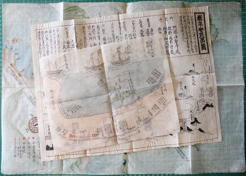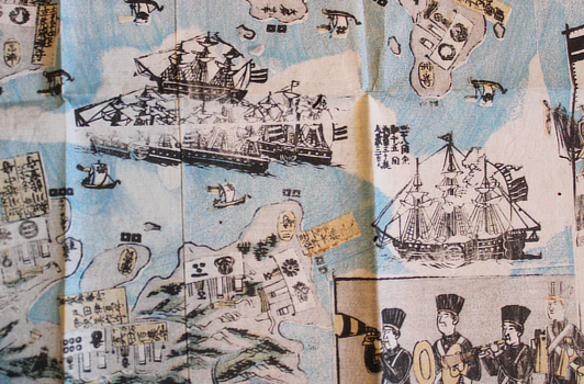 Three in one: list of defences on the right; American procession in the middle; and American ships and defence in the harbour on the left. This must be among the most deluxe kawaraban ever produced: two large sheets and colour. Usually a print this size, not that I'd seen one this long, would be on four joined sheets. So even cheap illicit news sheets have a hierarchy. This strengthens my suspicion that there was already a market of collectors as well as the no longer slack-jawed peasantry.