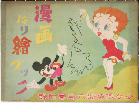 Took me a while but I figured out Betty is spelling Manga Hari-e Book with Mickey's tail.