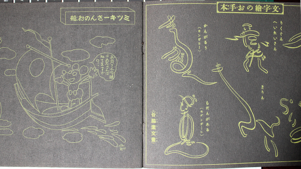 This is no.42 of Kanai Shinseido's long series of educational picture stories. Hmmm. Was this edition rushed out as a training manual? Miyazaki is too young to have owned a copy of this when new but his work is a direct descendant. The double folded leaves are a lavish touch for a cheap kids' book like this; it's a big step up from the akahon (red books) coming out of Osaka.
