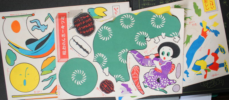Manga. 漫画はり繪ブック [Manga Hari-e Bukku]. Tokyo, Shojo Kurabu 1933 (Showa 8). 19x27cm publisher's colour illustrated wrapper; 12pp printed in yellow on thick black paper and six loose sheets of colour pop-out figures to be stuck in. Minor signs of use, one loose sheet has lost some of the top margin but not the pop-out pictures. Au$250