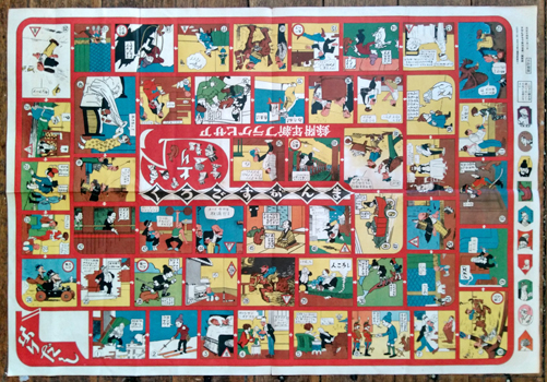 Manga Sugoroku. まんがすごろく [Manga Sugoroku]. Asahi Graph 1925 (Taisho 14). Colour broadsheet 54x79cm. On the back is a monochrome game that features Daikokuten and a map of Japan; it doesn't look very interesting. Some near invisible repairs to folds. With the playing pieces in the margin. Au$375