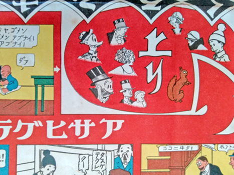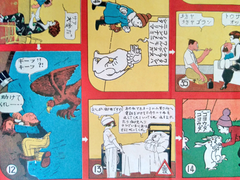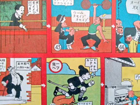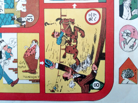 The new year gift from the magazine Asahi Graph celebrates the introduction and embrace of the American comic strip in Japan along with a couple of local heroes. Mutt, Jeff, Jinks, Maggie et al share the page with that pom-pom kid and his squirrel friend - or vice versa - I forget their names*. But I notice that everyone sticks to their own boxes; Jinks, Mutt and the squirrel play the same stage but not together. Such behavior came later.