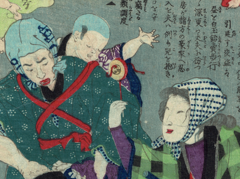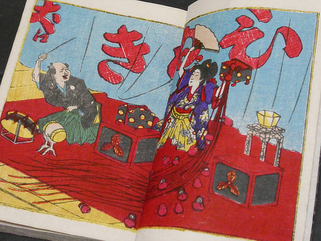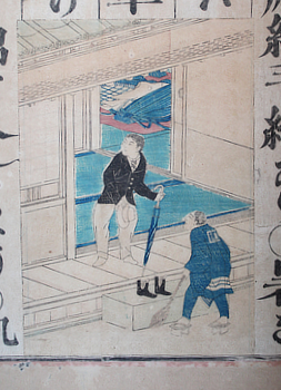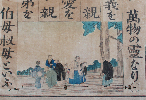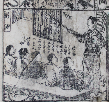 The various editions and versions of the Shogaku Nyumon and similar elementary primers show that these wall charts were revised and adapted for some years. The miniature versions in the books are changed and reorganised but these originals can still be recognised; who could mistake that hairpiece and nose? Commercial colour woodcuts of the charts in use were also produced by canny publishers: teacher pointing and attentive kids on the floor. The charts were exaggerated so that they could still teach even in such reduced form. Kiyochika did at least three in 1874.