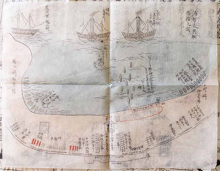 [1] Perry's black ships anchored off Uraga during the first visit in June 1853. The dotted red line shows the American march to the tent. I thought the snake line was so that all troops could form a parade on the short stretch from the shore to the tent but I have seen a drawing with, instead of an empty beach, a fabric barricade between the landing point and the tent. Think demeaning airport queue control. Did that barrier exist or was that one artist's invention?