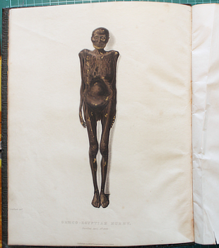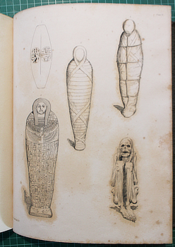 PETTIGREW, Thomas Joseph. A History of Egyptian Mummies, and account of the worship and embalming of the sacred animals by the Egyptians; ... London, Longman 1834. Quarto contemporary straight grain green calf decorated in gilt and blind; 13 plates, four coloured. Foxing or browning of the uncoloured plates, thanks to the paper: a bit of browning here and there; frontispiece tissue and gutter of the title creased.