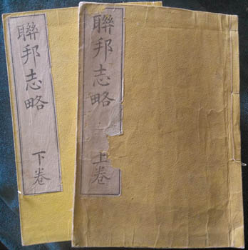 First edition of the adaptation by Mitsukuri Genpo of the American missionary Bridgman's Da Mei lian bang zhi lue published in Shanghai in 1861 or 62; this was reprinted in 1871. The Shanghai version has been wrongly claimed as the first account of the United States in Chinese - but it's sort of true as it is a revision of Meilige heshengguo zhilue published by Bridgman in Singapore in 1838. For the Japanese this is their first thorough and ostensibly trustworthy account, written as it is by an actual American.
