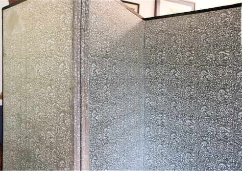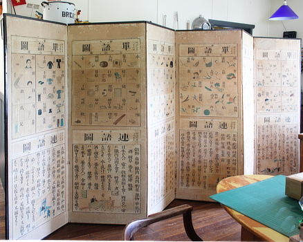 School screen. 單語圖 + 連語図 [Tangozu + Rengozu]. Tokyo, Monbusho1874 (Meiji 7). Folding screen, a byobu, of six panels; paper over a timber frame. Each panel is 176x64cm, ie it's close enough to four metres opened right out. Each panel has a Tangozu wall chart mounted above a Rengozu chart, with colour woodcuts, numbered one to six. Each chart is about 77x54cm, some a bit larger or smaller. The back is patterned green paper printed by stencil or block. Bugs have been busy in places but only in the mounting paper, not the charts. Some holes or bashes in the back of the first panel - what would be the front cover if you imagine this as a book - have been repaired with Japanese tissue. Browning. The holes are mostly down low, where small children or errant bits of furniture operate.