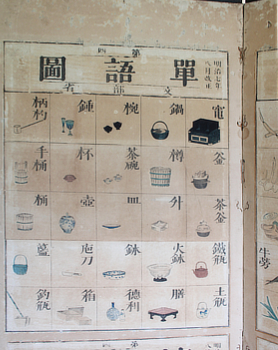 However, the following year, 1874, a revised edition was published by the Ministry of Education, and the Normal School version was discontinued after just one year. Looking specifically at the revised sections, out of the 210 words, there are four changes to the word itself and 29 changes to spelling. (A rough translation from Dictionaries and Beyond published online by Sanseido. They illustrate it with images from an elementary book, not the charts).
