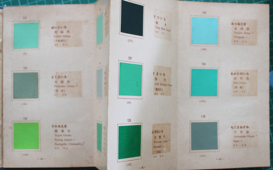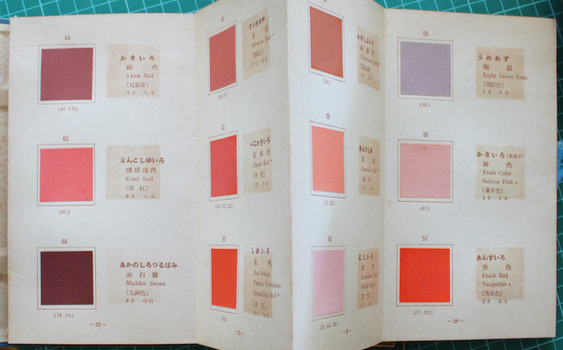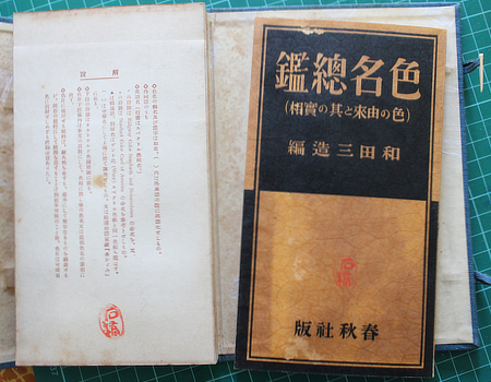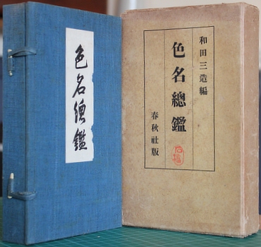 Wada Sanzo. 色名総鑑 [Shikimei Sokan]. Tokyo, Shunjusha 1931 (Showa 6). 20x12cm publisher's cloth case with title label with 160 mounted colour samples on 56 accordian folding card leaves; and wrappered book; 178pp and some tables (two folding). Browning and the usual offsetting of the card; still a good enough copy in the original printed card outer folding case (this browned and dusty). Colour samples named in Japanese, English and occasionally French or German; two of the tables are multi language lists of colour names. Au$600